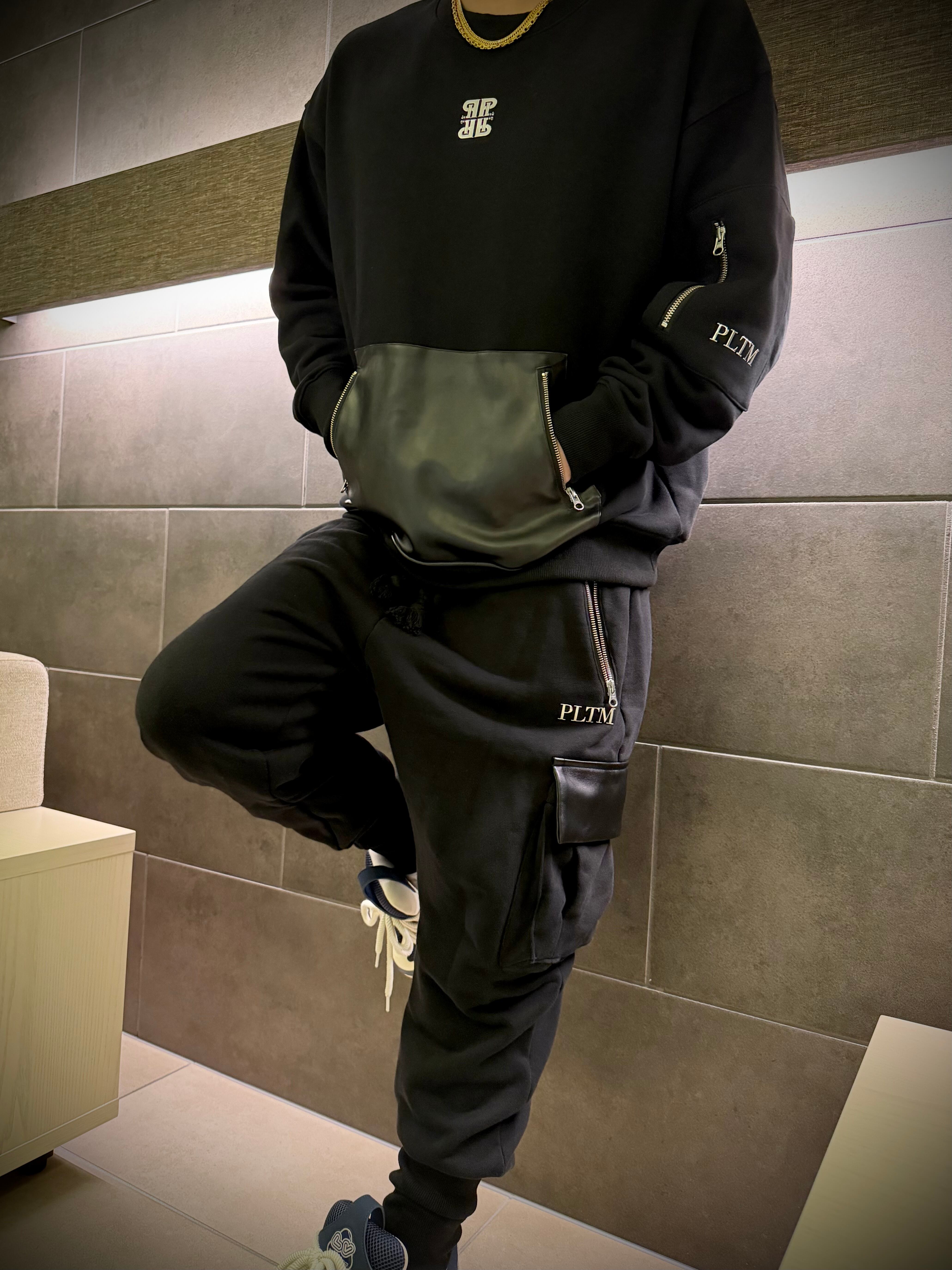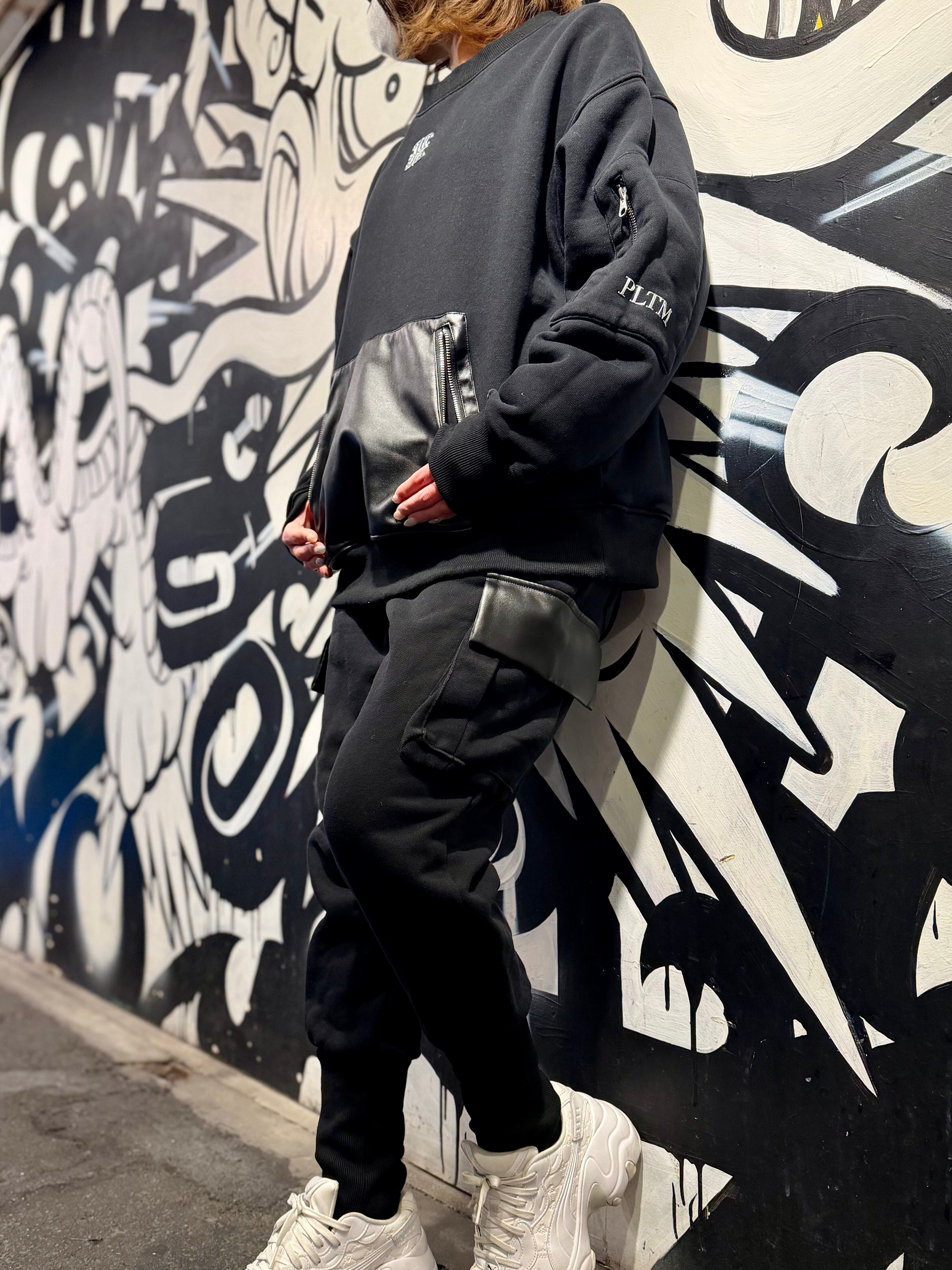 シンプルでありながら機能性を兼ね備えたPLTM LOGO トレーナー BLACKは、スタイリッシュなデザインと快適な着心地が魅力の一枚です。このトレーナーには、フロントポケットにチャック付きのフェイクレザーを使用し、左袖にはチャック付きポケットを追加しており、使い勝手も抜群です。フリーサイズでの展開なので、どなたでもリラックスして着用できるデザインになっています。